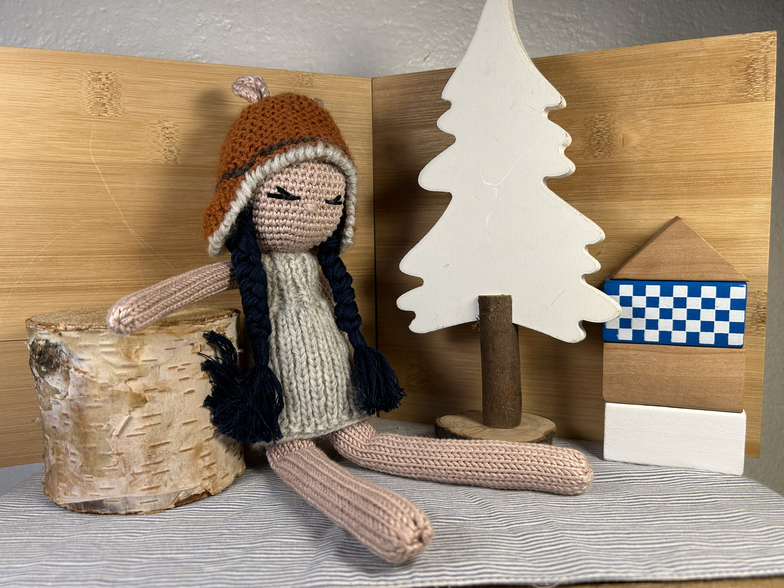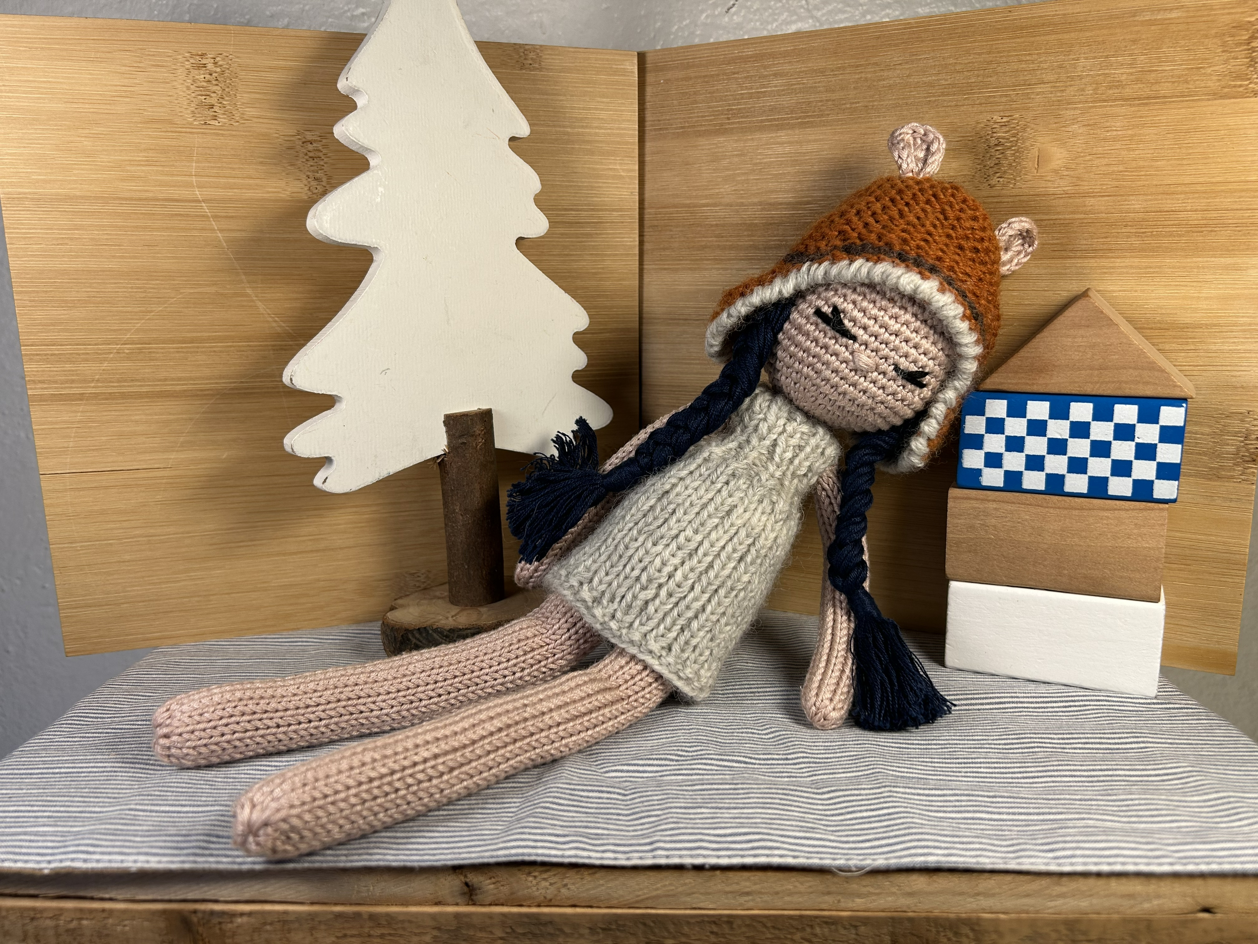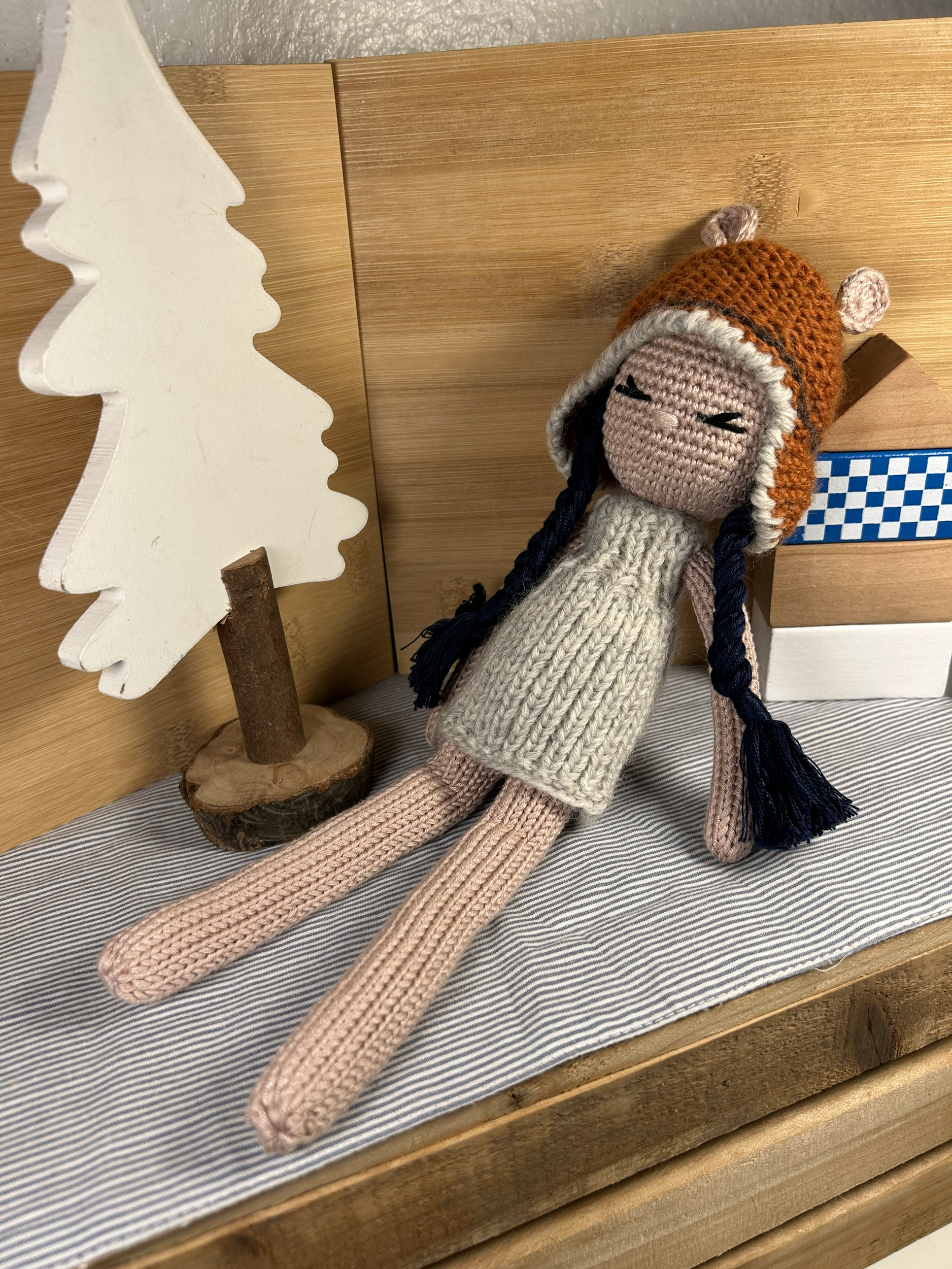 Cette poupée porte un bonnet et une robe tricotés en 100 % laine. Ses nattes sont en coton bleu marine. Ses yeux sont brodés.