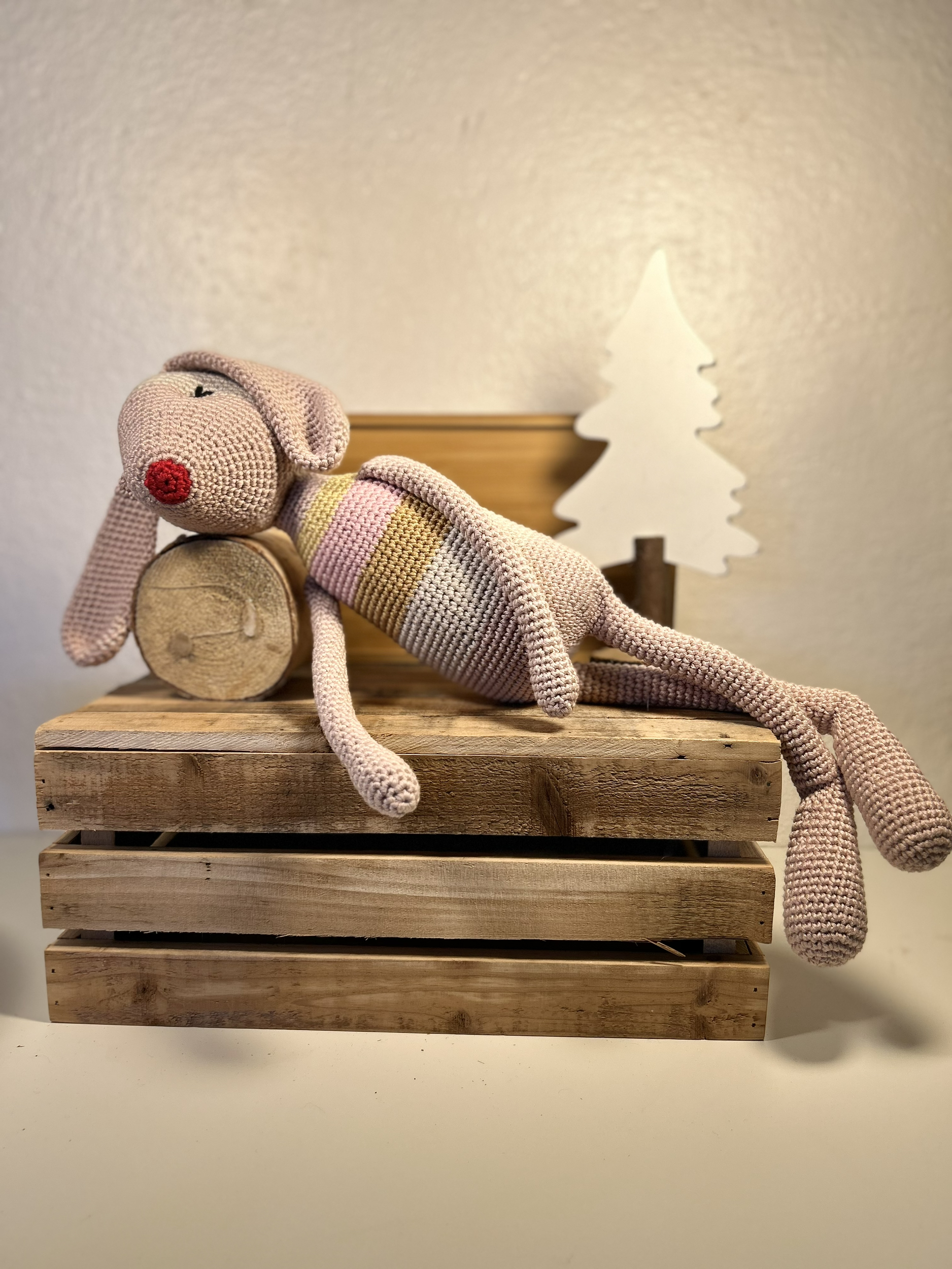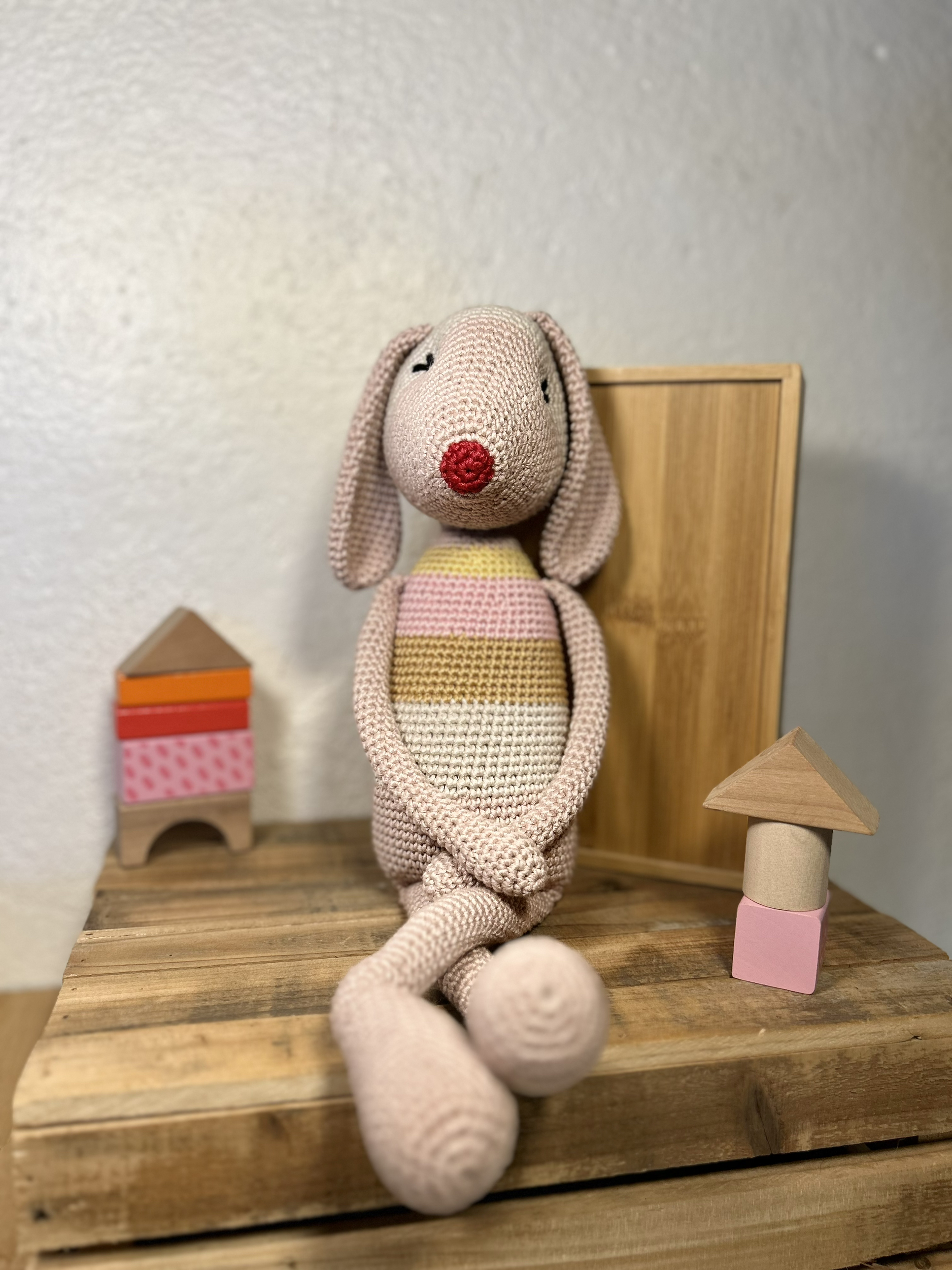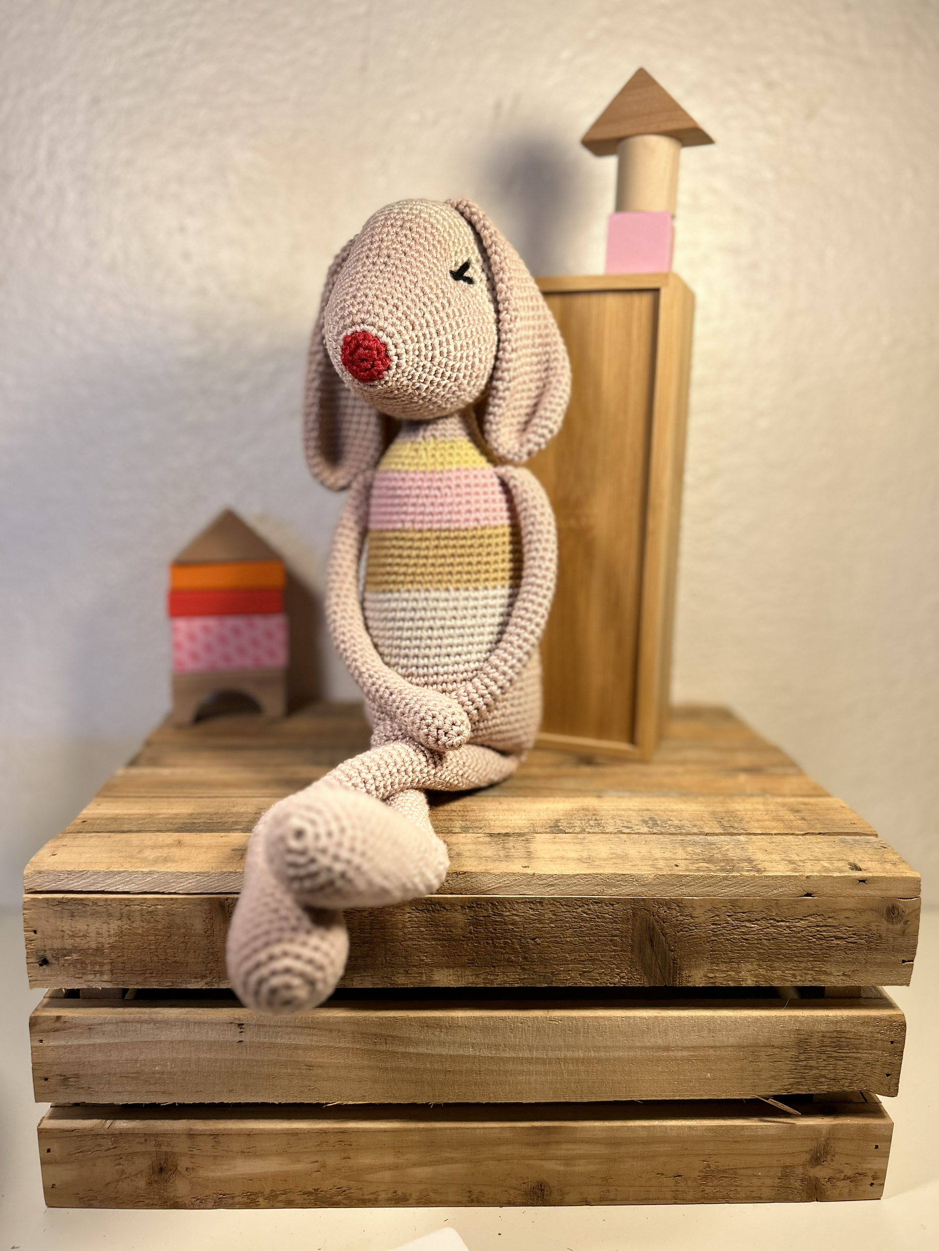 Lapin tricoté dans un camaïeu de rose, 100 % coton. yeux brodés.