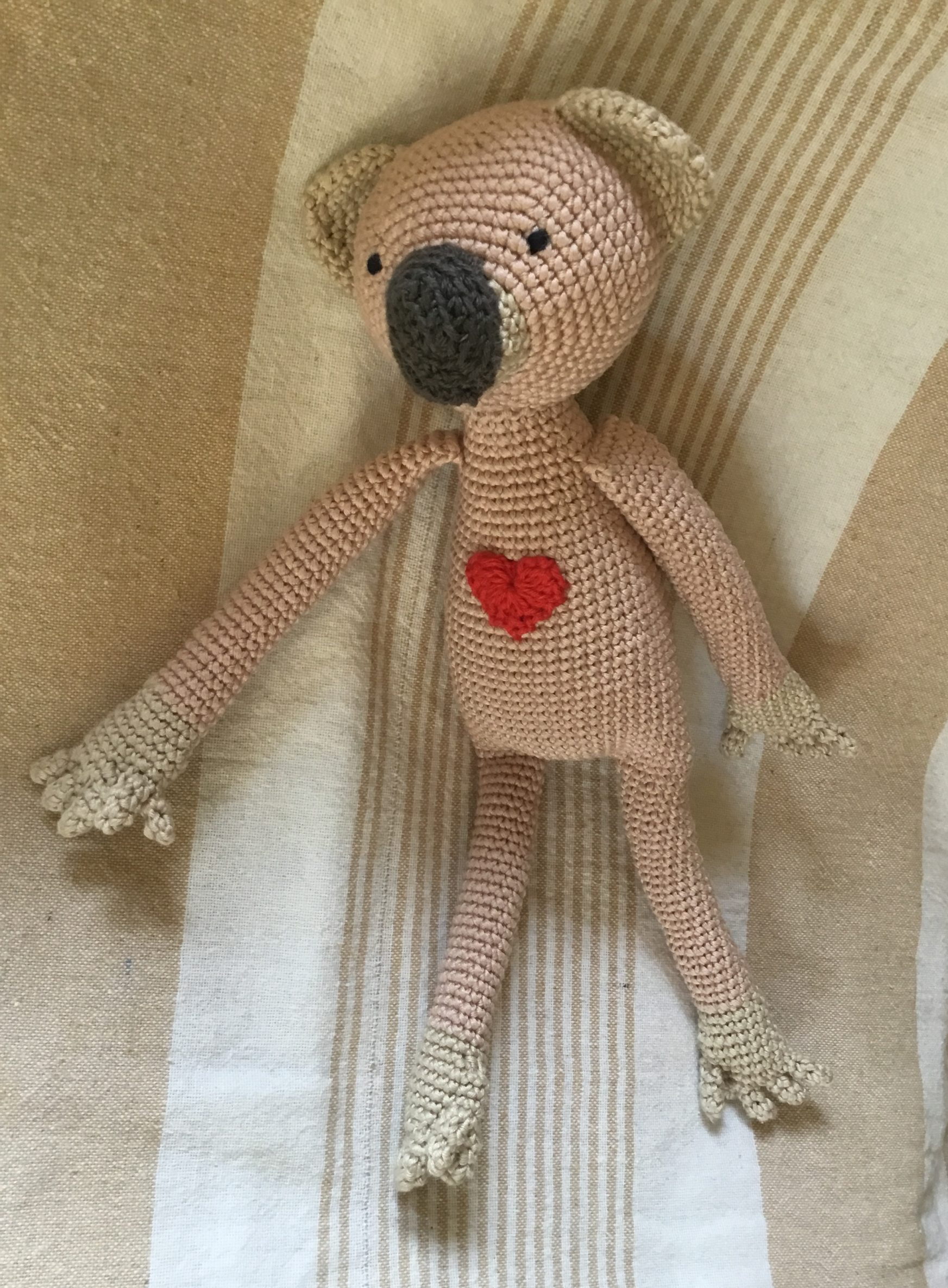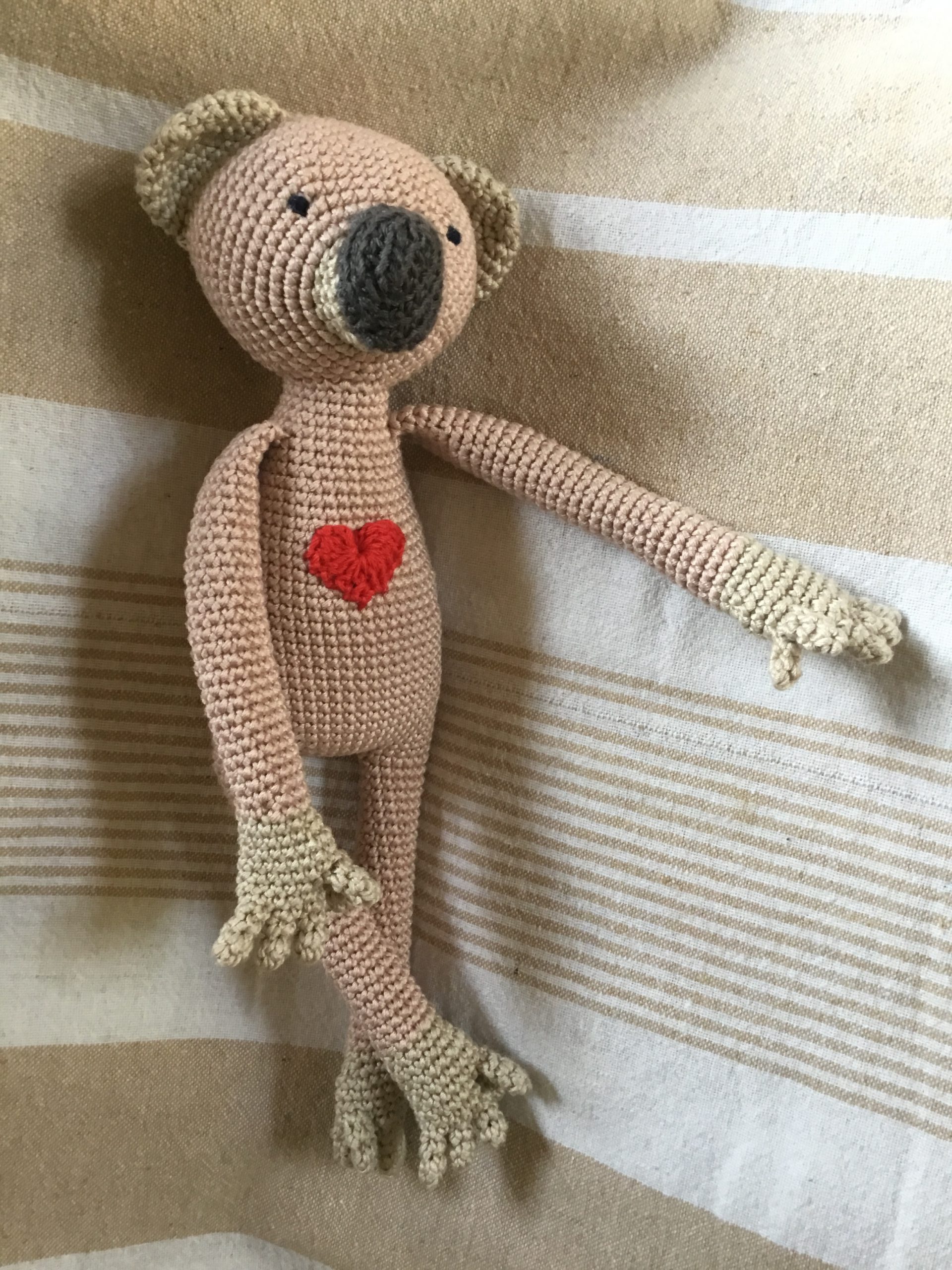 KOALA est un doudou crocheté en fil 100 % coton. Ses mains ont des doigts et ses pieds des orteils. Un petit cœur rouge apporte une note de tendresse à ce petit animal rose et beige.