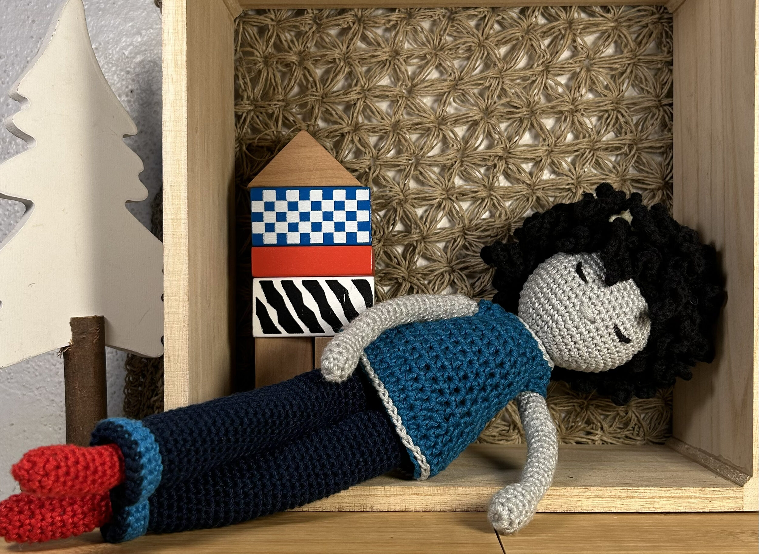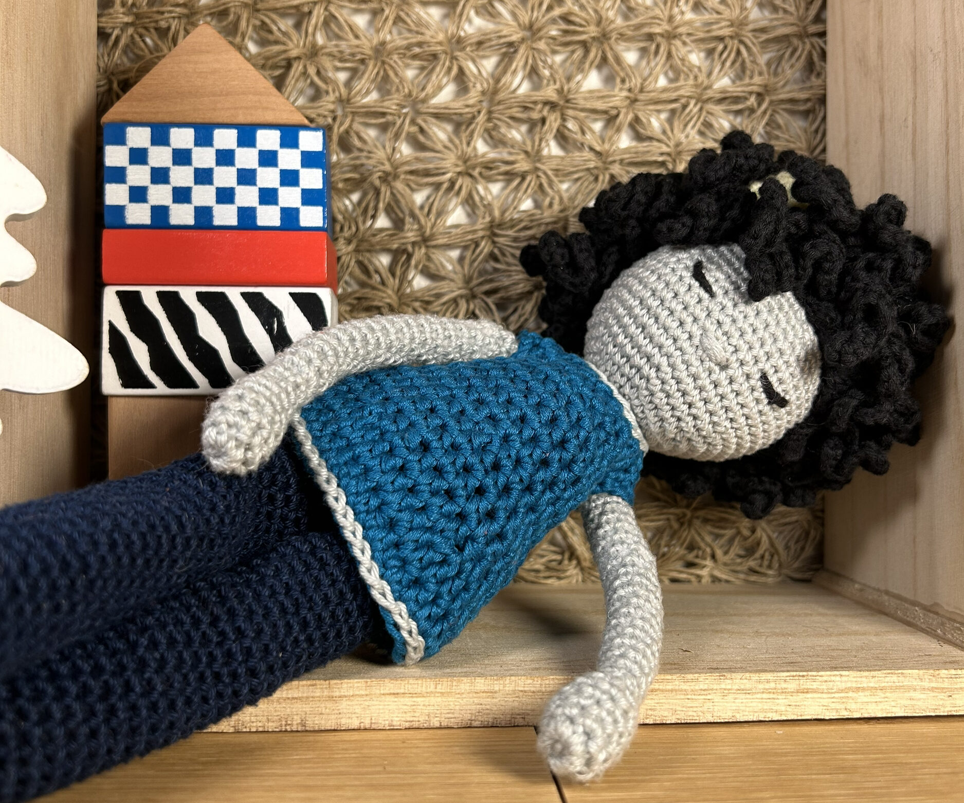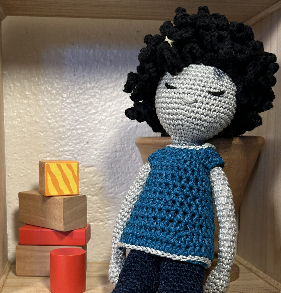 Poupée métisse tricotée en fil 100 % coton. Coiffure "africaine". Vêtements 100 % coton.