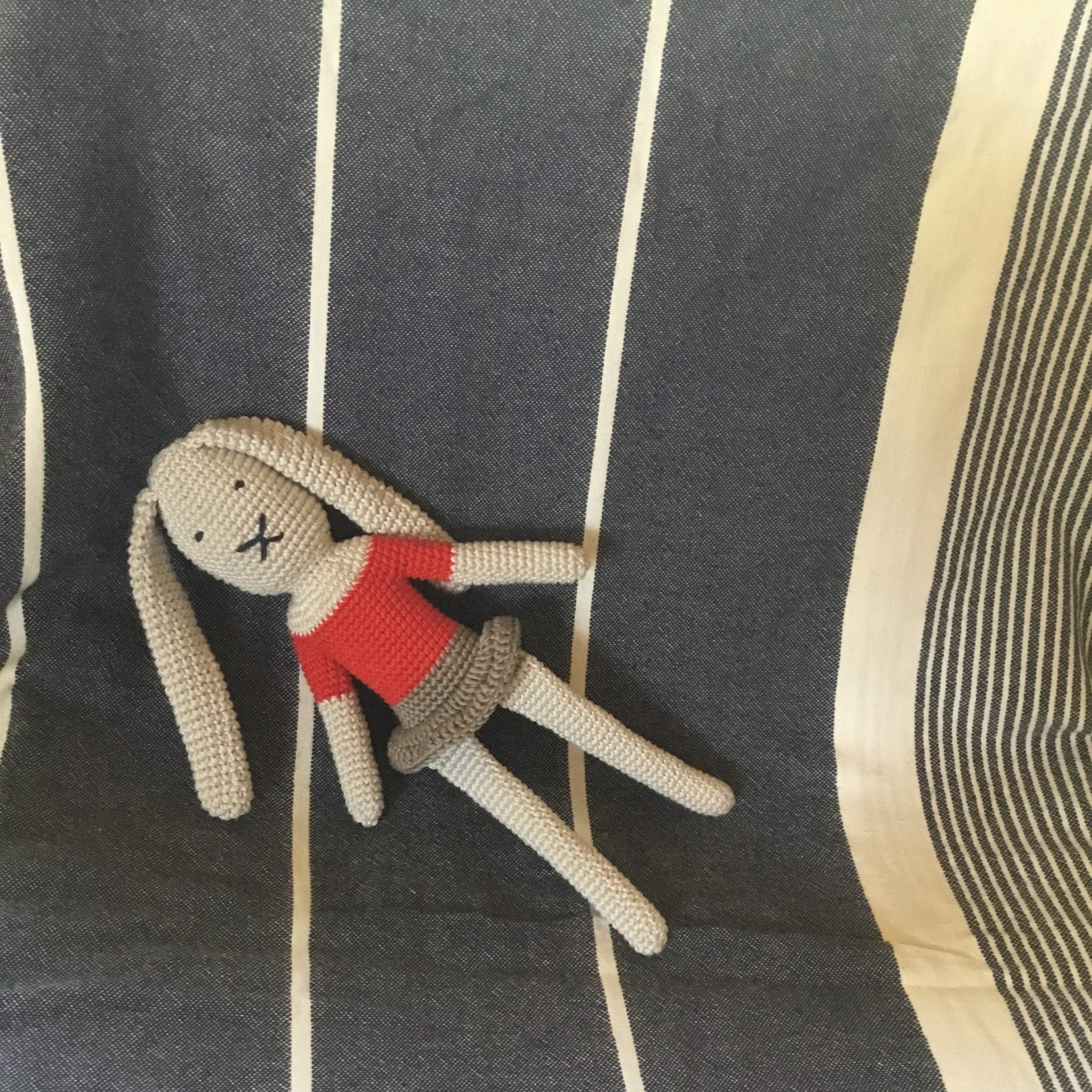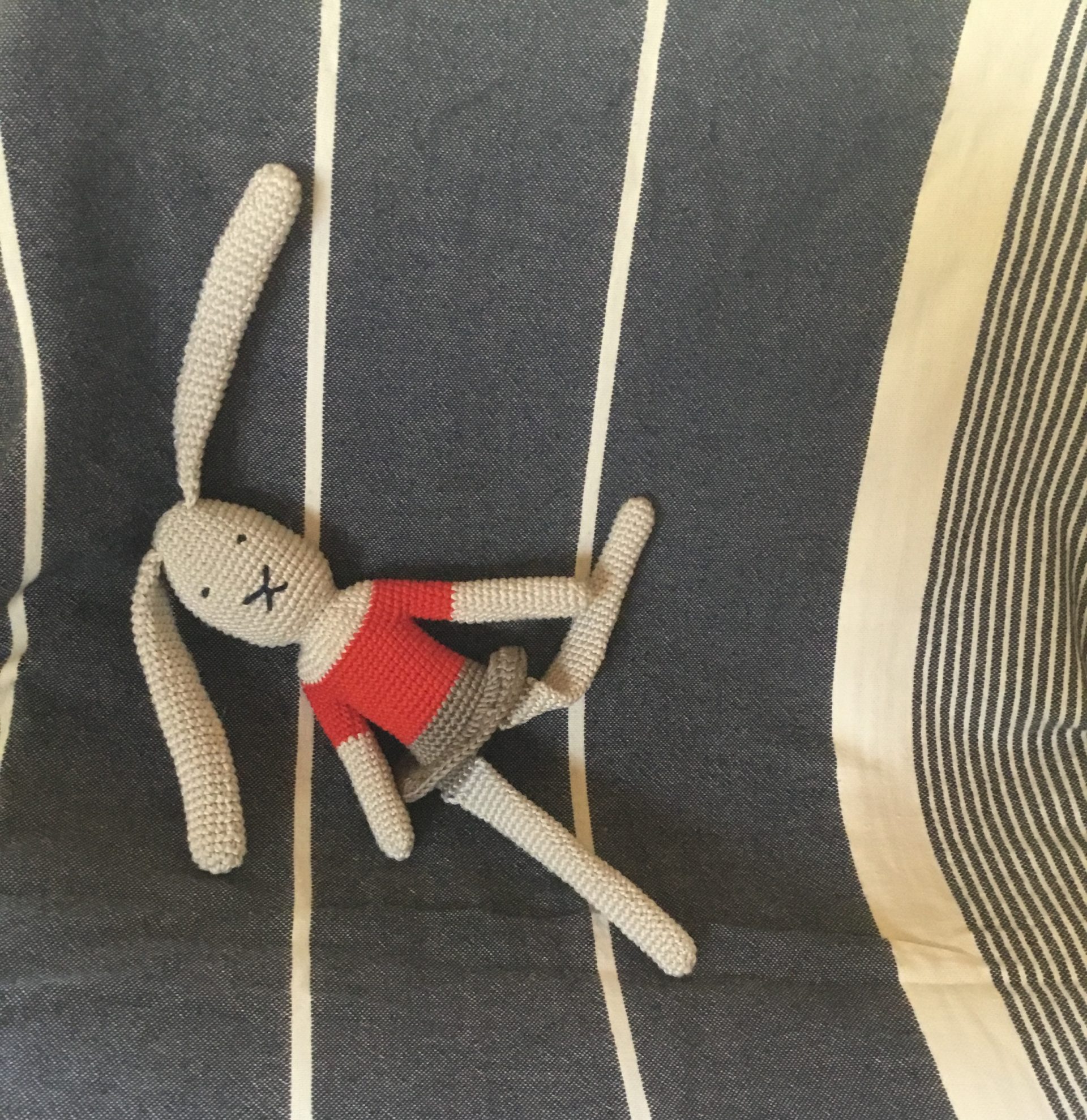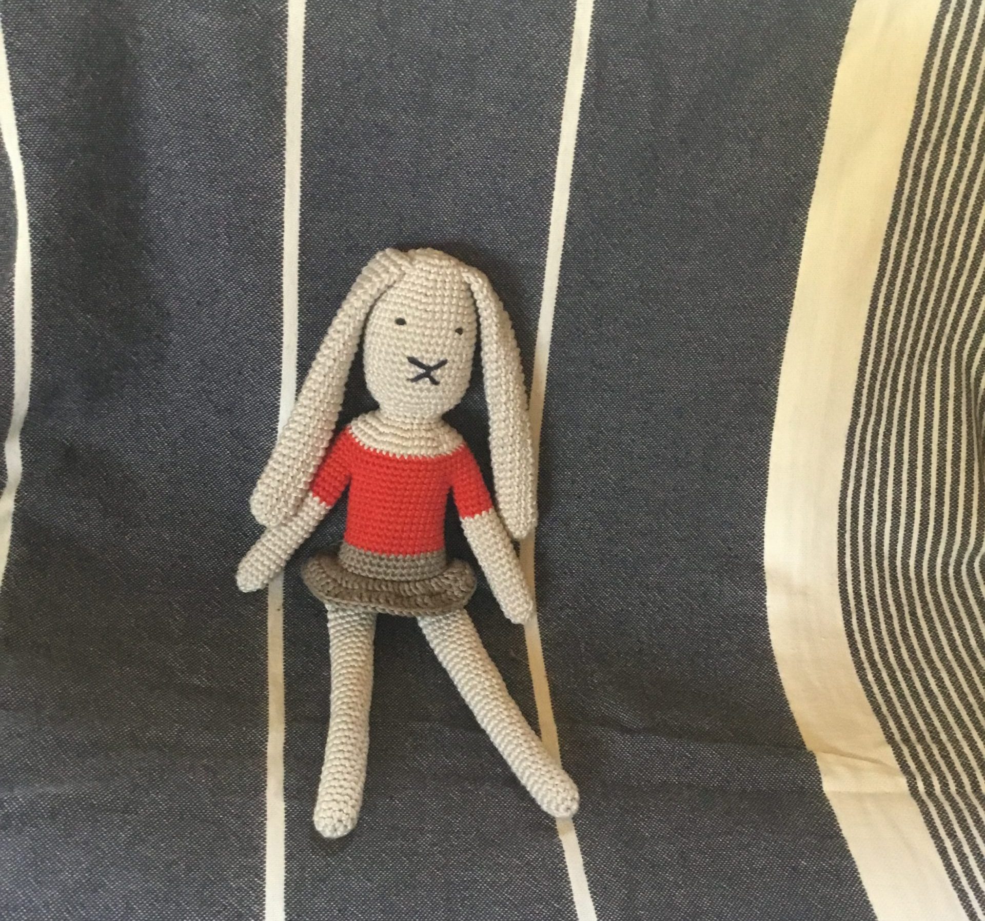 Cette jeune lapine a enfilée sa mini jupette. Ses oreilles se confondent avec une longue chevelure. Elle est tricotée à la main bien sûr, en fil 100 % coton. Coloris : gris clair - rouge - gris foncé. Nul doute qu'elle ravira une petite fille ou un petit garçon.
