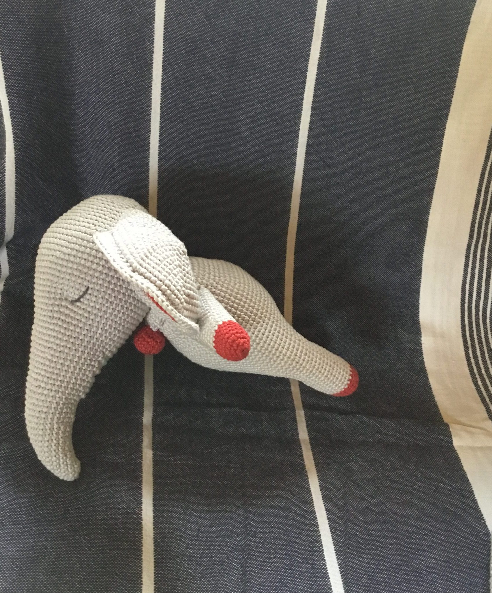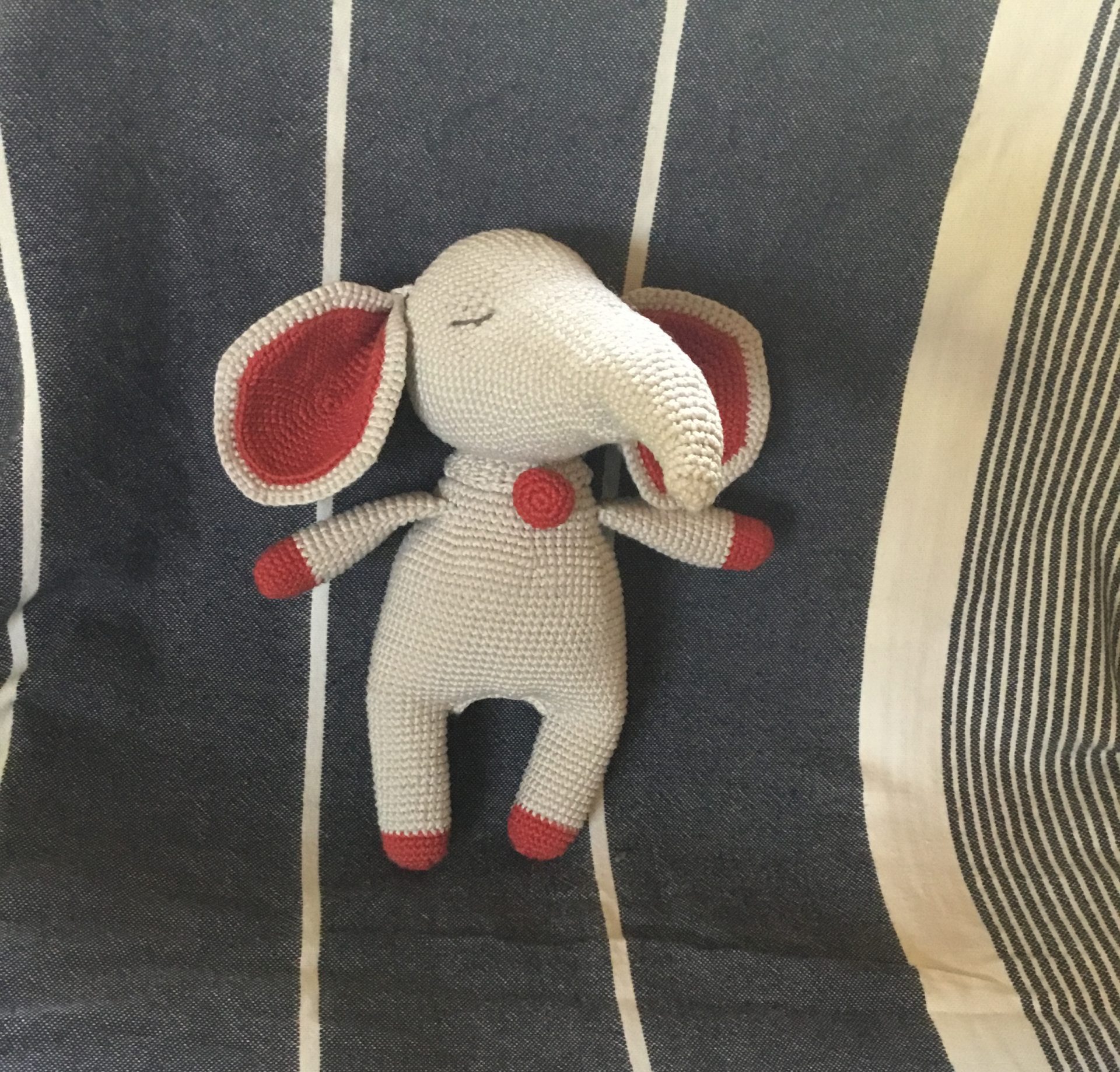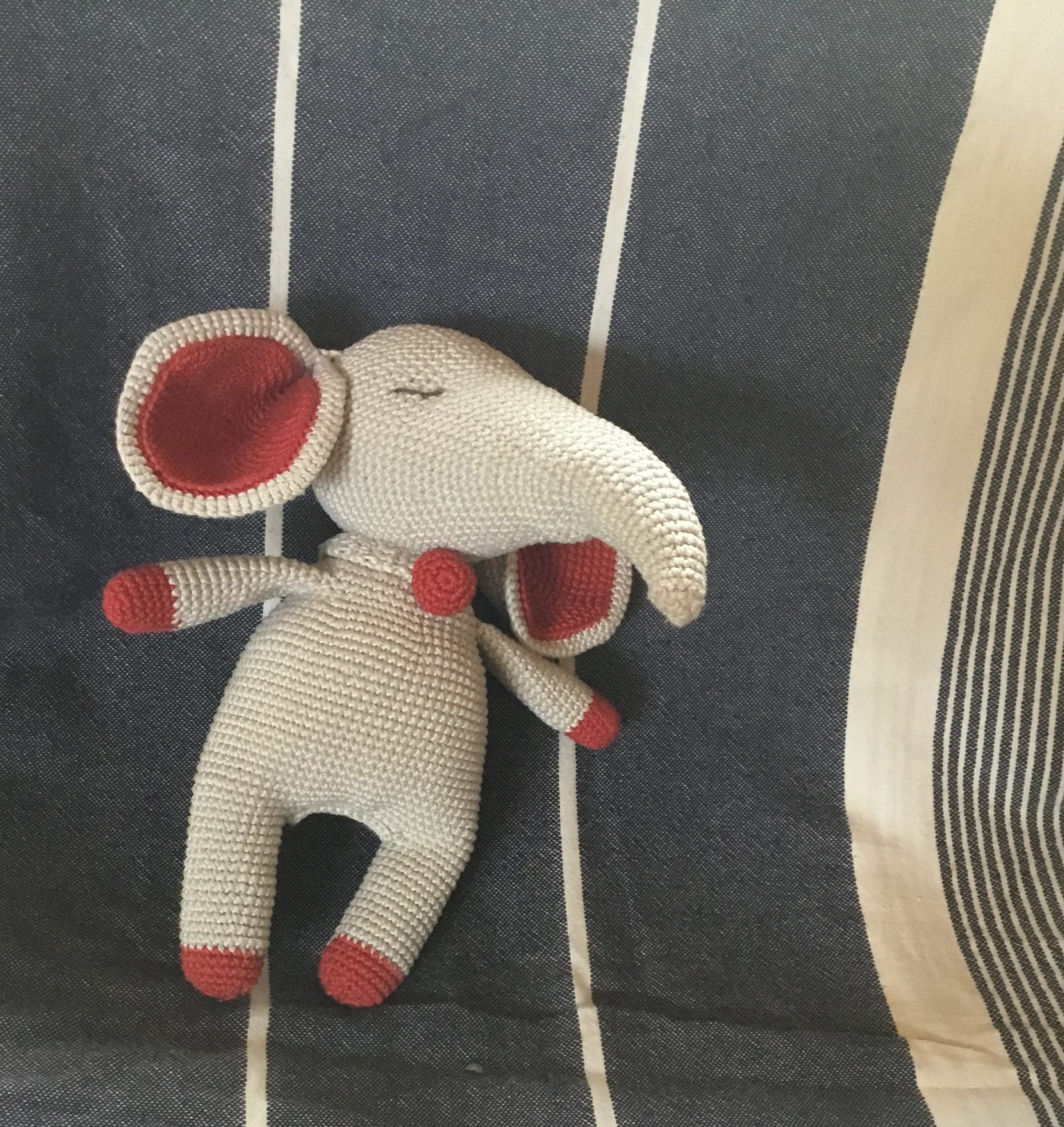 Eléphant tricoté en fil 100 % coton, coloris gris/rose. Une petite boule orne son collier. Les bras ne sont pas remplis ce qui facilite la préhension.